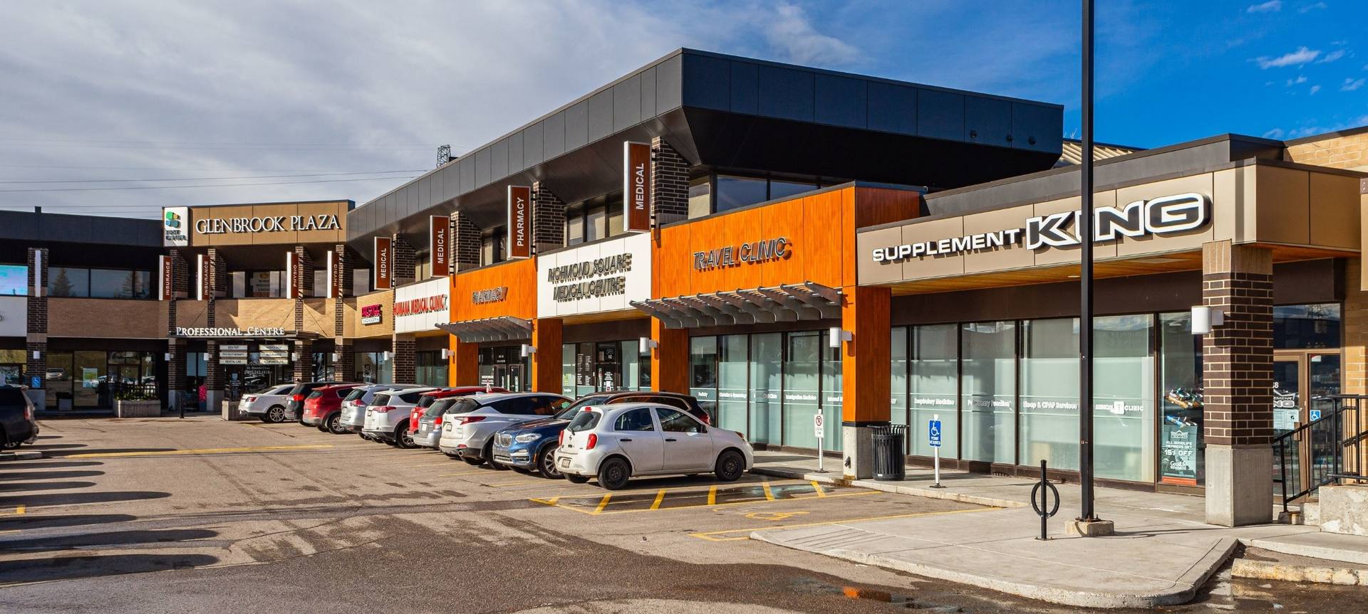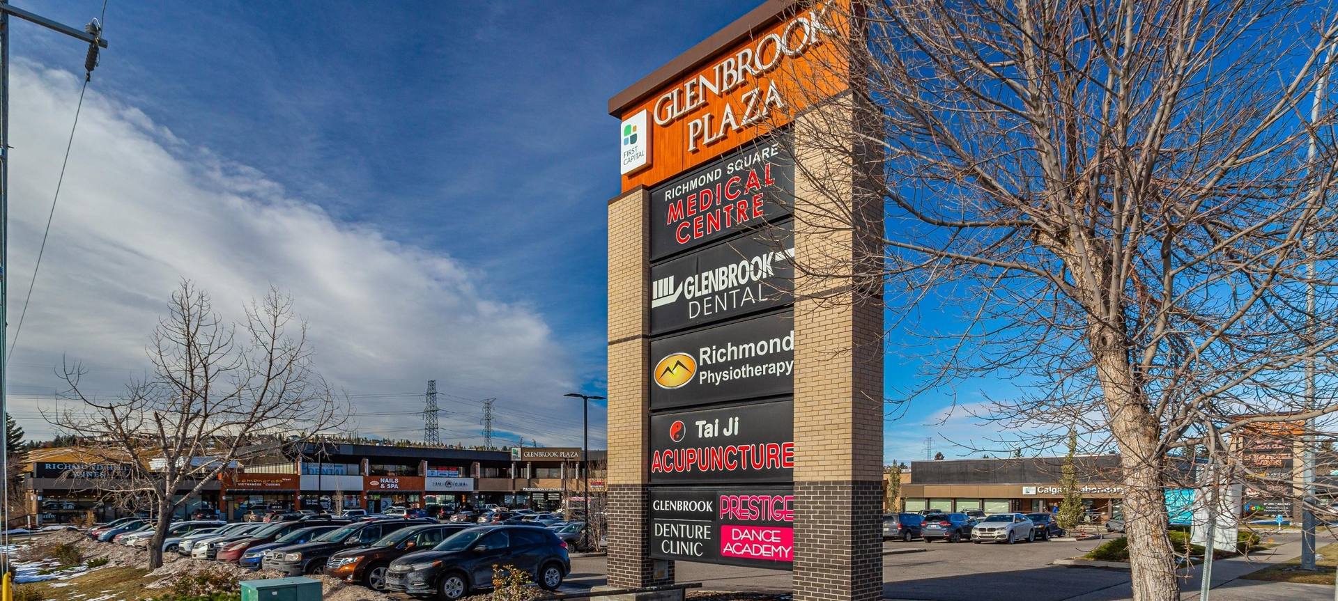 Glenbrook Plaza is a two-storey open-air centre located just off Sarcee Trail in the lively Glenbrook community, surrounded by homes, schools, and community centres. It features medical clinics, wellness centres, salons, and food services. The plaza is shadow-anchored by major retailers like GoodLife Fitness, and Save-On-Foods across the street at Richmond Square.